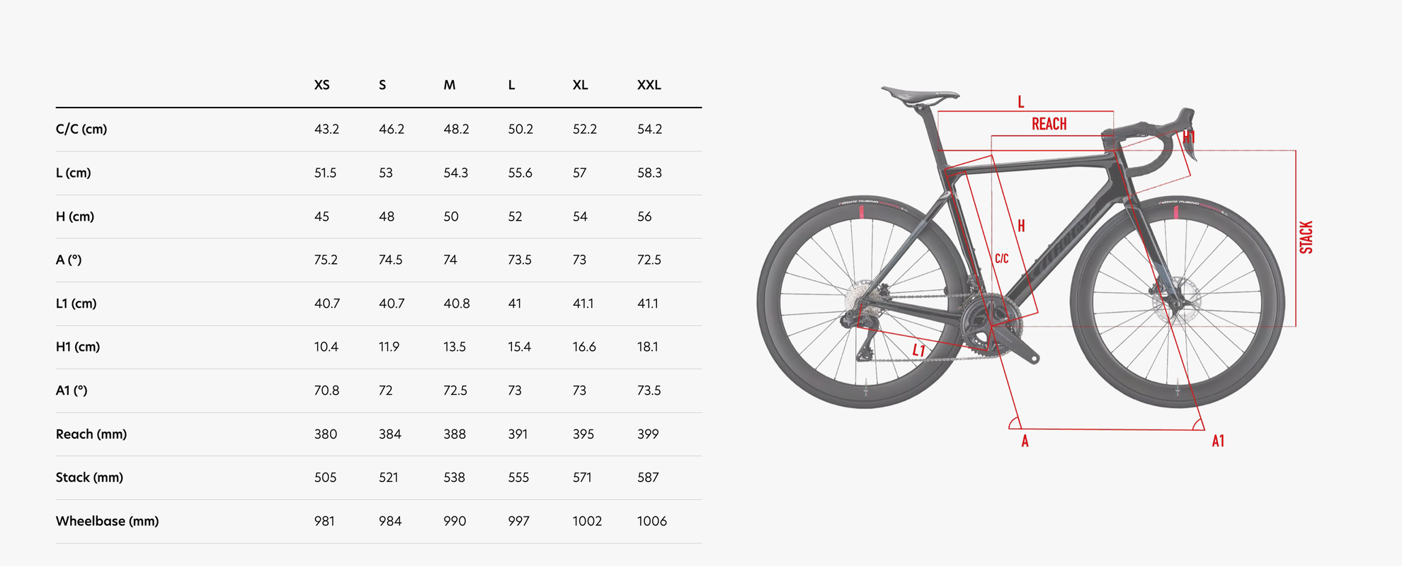 Grupa osprzętu Shimano 105 Di2 Rozmiar koła 28″ Materiał ramy Carbon Lakier Połysk Rodzaj hamulca Tarczowe hydrauliczne Napęd 2×12 Rama CARBON MONOCOQUE NHU MOD + HIGH IMPACT STRENGHT Widelec CARBON MONOCOQUE NHU MOD + HIGH IMPACT STRENGHT Kierownica BARRA SL 320g Mostek STEMMA SL Stery WILIER CUSTOM BEARINGS SUPERSLIM Klamkomanetki SHIMANO 105 Di2 12S ST-R7170 Hamulce Przód: SHIMANO 105 BR-R7170; Tył: SHIMANO 105 BR-R7170 Tarcze Przód: SHIMANO CENTER LOCK SM-RT70 (160); Tył: SHIMANO CENTER LOCK SM-RT70 (140) Przerzutka przednia SHIMANO 105 Di2 FD-R7150 Przerzutka tylna SHIMANO 105 Di2 12S RD-R7150 Mechanizm korbowy SHIMANO 105 FC-R7100 50-34T Kaseta SHIMANO 105 12S CS-R7100 11-34T Łańcuch SHIMANO CN-M7100 12S Suport SHIMANO PRESSFIT BB-RS500-PB Siodło SAN MARCO SHORTFIT STARTUP Sztyca FILANTE SLR CARBON WILIER CUSTOM MADE -15 mm / 0 mm Opony VITTORIA RUBINO 700×28 Koła MICHE SWR 50 CARBON Waga Waga ramy : 1010 g +/- 5%; Waga widelca : 370 g +/- 5% GEOMETRIA
